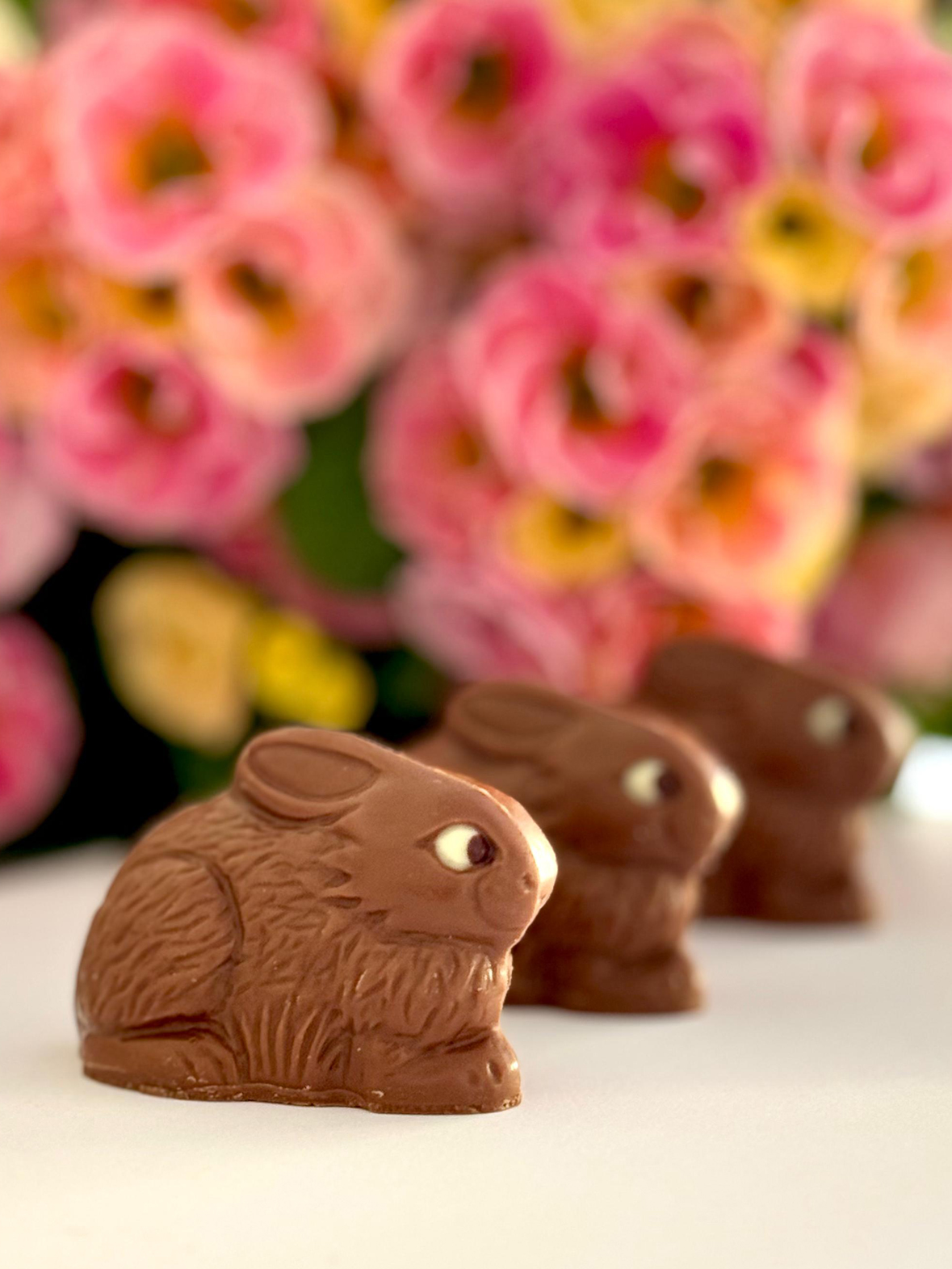 Wir verkaufen feine Schokolade von Sahnehäubchen aus Steffisburg. Beispielsweise mit Gianduja gefüllte Häschen.