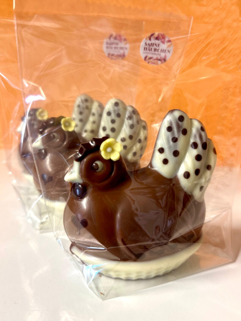 Wir verkaufen feine Schokolade von Sahnehäubchen aus Steffisburg. Beispielsweise mit Gianduja gefüllte Häschen.